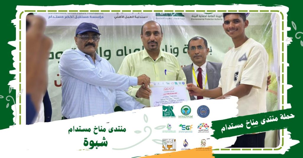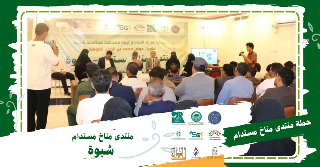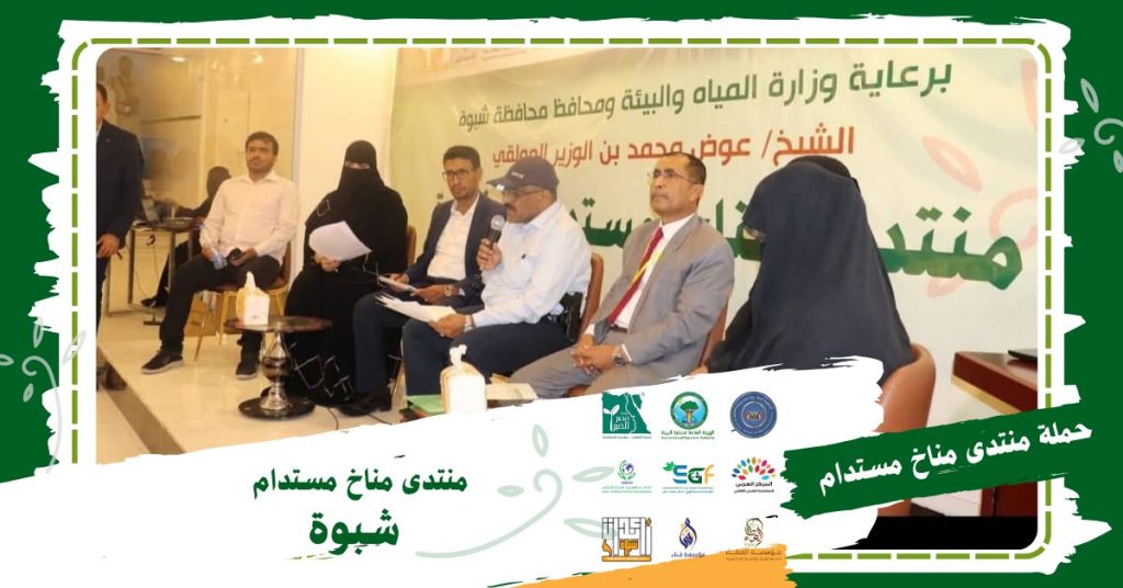 ويأتي المنتدى ضمن #حملة_مناخ_مستدام في اليمن التي تنظمها مؤسسة مستقبل أخضر مستدام SGF بالشراكة مع المركز العربي لاستدامة العمل الأهلي – مؤسسة مصر الخير و Union of Green Climate Organizations إتحاد منظمات المناخ الاخضر للتنمية ، وبرعاية وزارة المياه والبيئة – اليمن و EPA Yemen – الهيئة العامة لحماية البيئة، وبمشاركة الشركاء في محافظة شبوة مؤسسة العطاء لحماية البيئة والتنمية المجتمعية و مؤسسة قنا للحقوق والاعلام والتنمية وفريق رائدات شبوة.